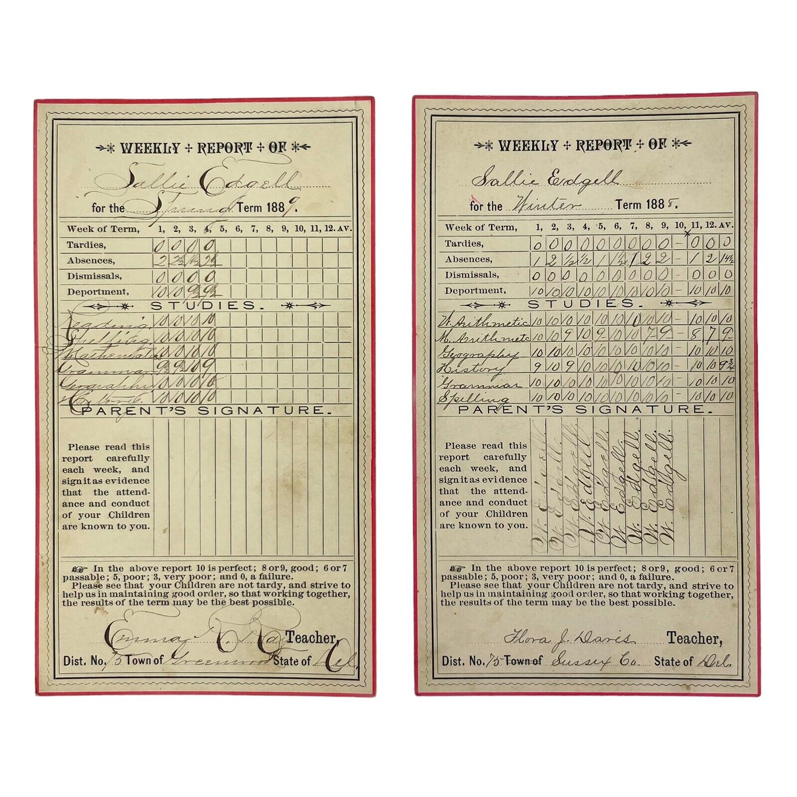 Antique 1888 & 1889 School REPORT CARDS Greenwood Sussex County DELAWARE
