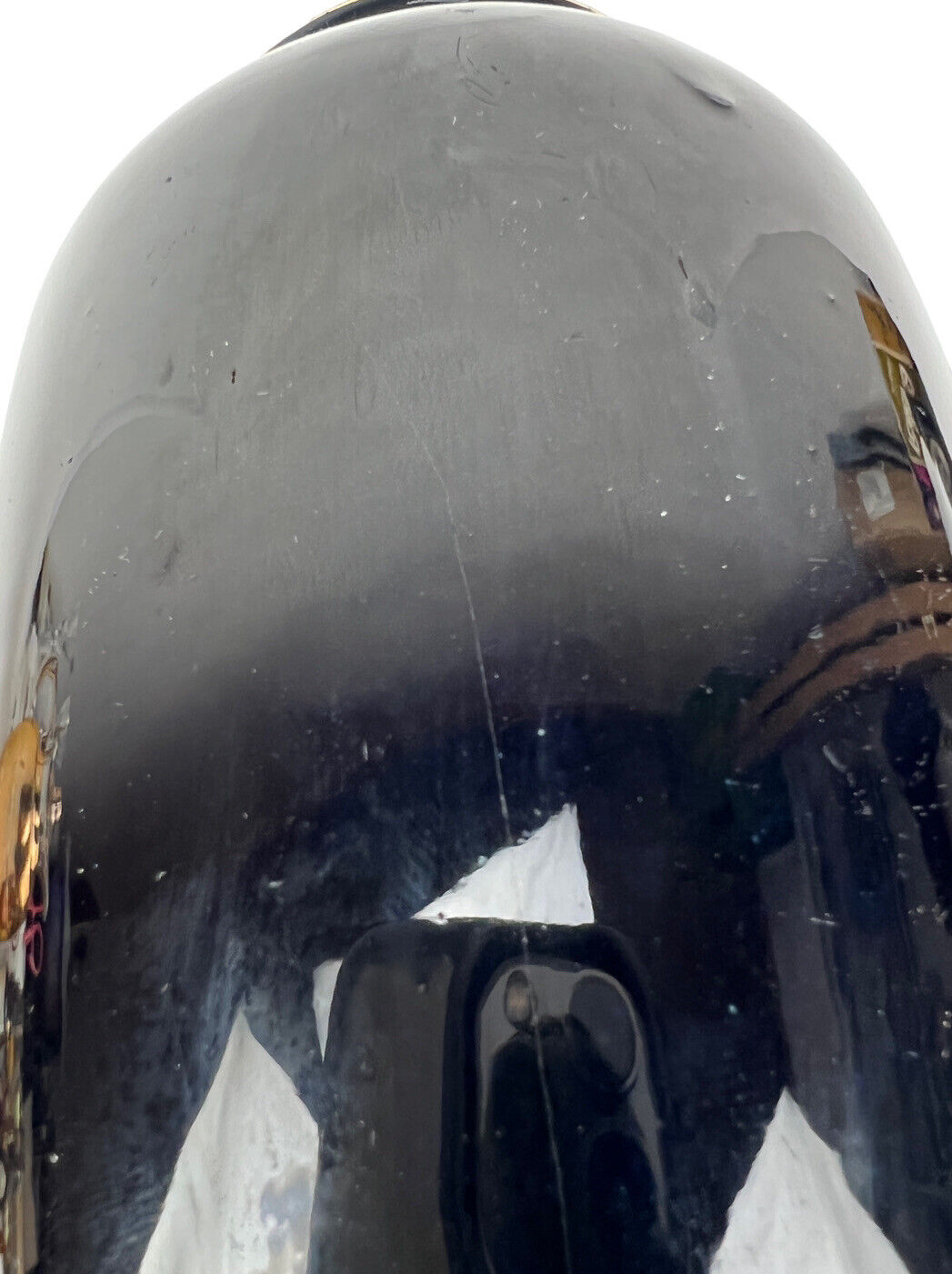 There is a crack to the back side, can be seen in photos from inside, and closeup from outside. Not very noticeable outside. There is some wear to the blue surface throughout, but overall good condition besides the crack. See photos for details.